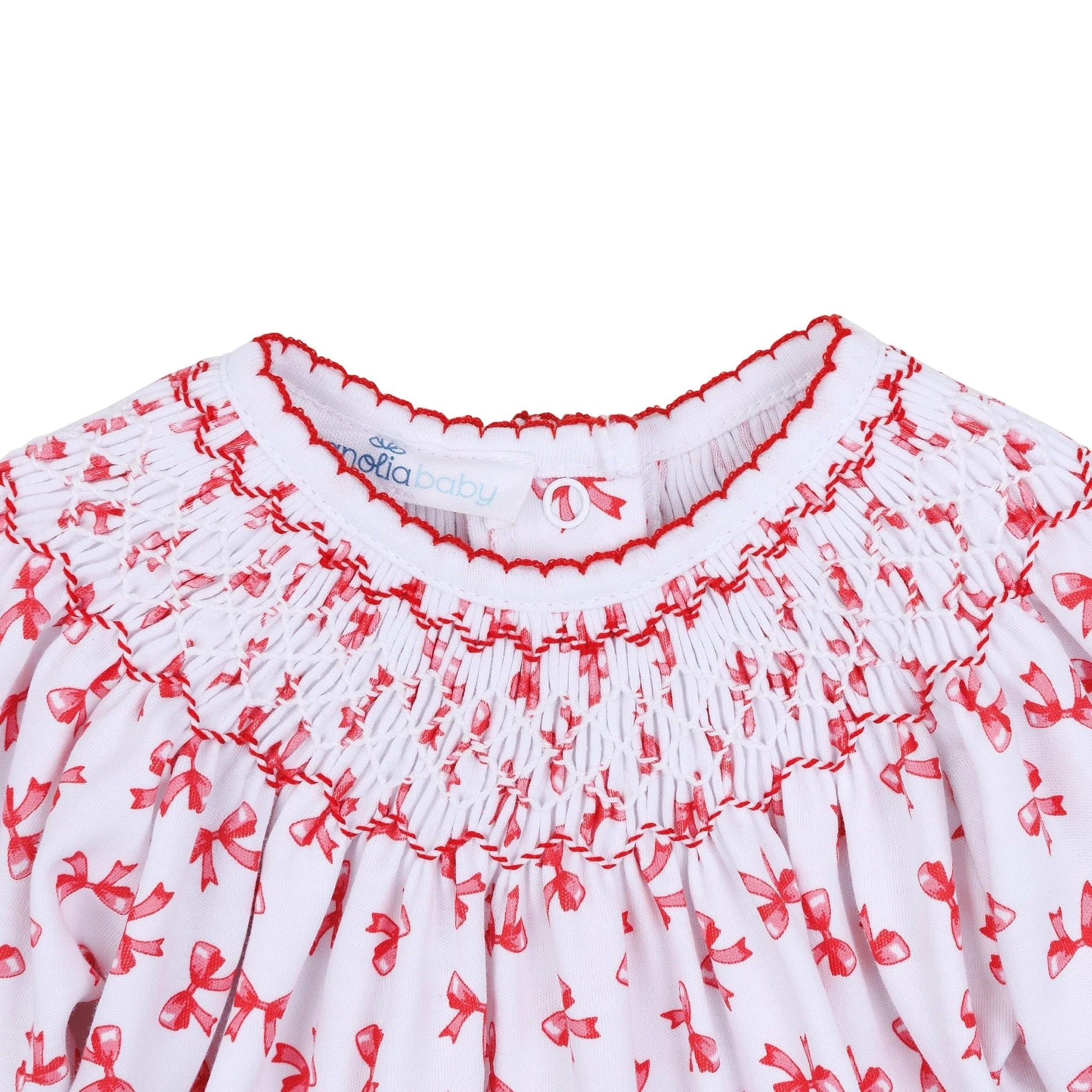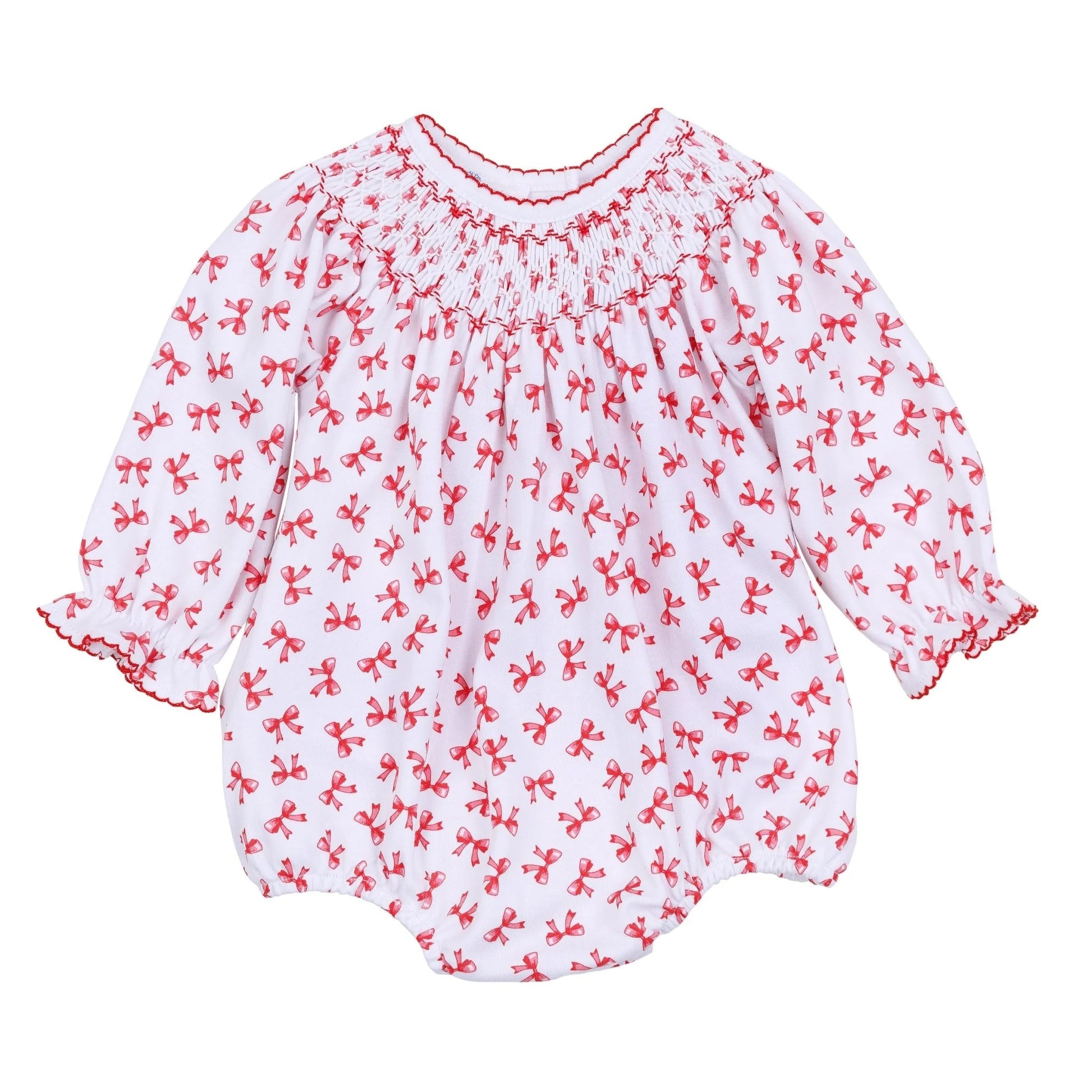 Celebrate special moments in this Bishop-style bubble, crafted from luxurious white Pima Cotton. It features a charming all-over bows print with a delicate gathered neckline and red picot trim, offering a timeless and comfortable silhouette.